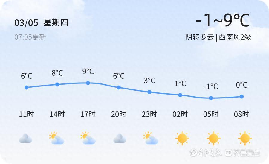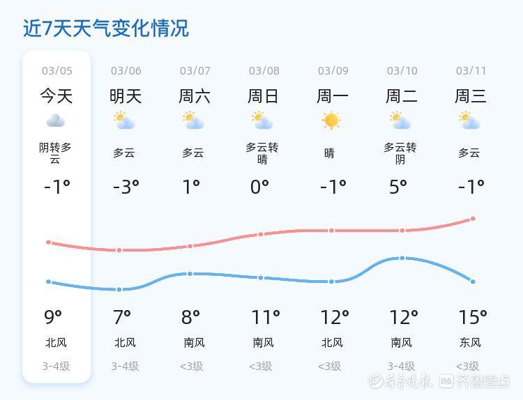 未来三天,泰安天气以多云为主,气温波动较大,最高气温可达11°C,最低气温为-3°C。其中,3月8日天气转晴,3月9日为多云转阴,风力有所增强。市民需注意天气变化,及时增添衣物,防范感冒。